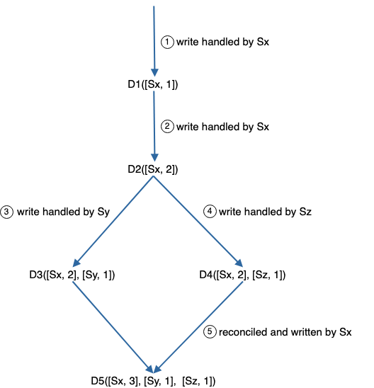 - Version X is a sibling (conflict exists) of version Y if there is any participant in Y’s version clock who has a counter that is less than its corresponding counter in X